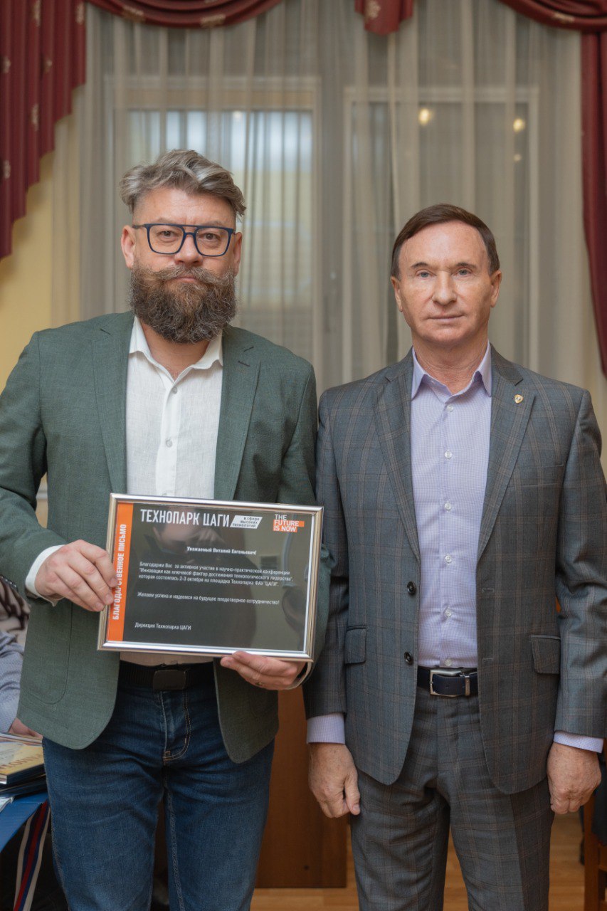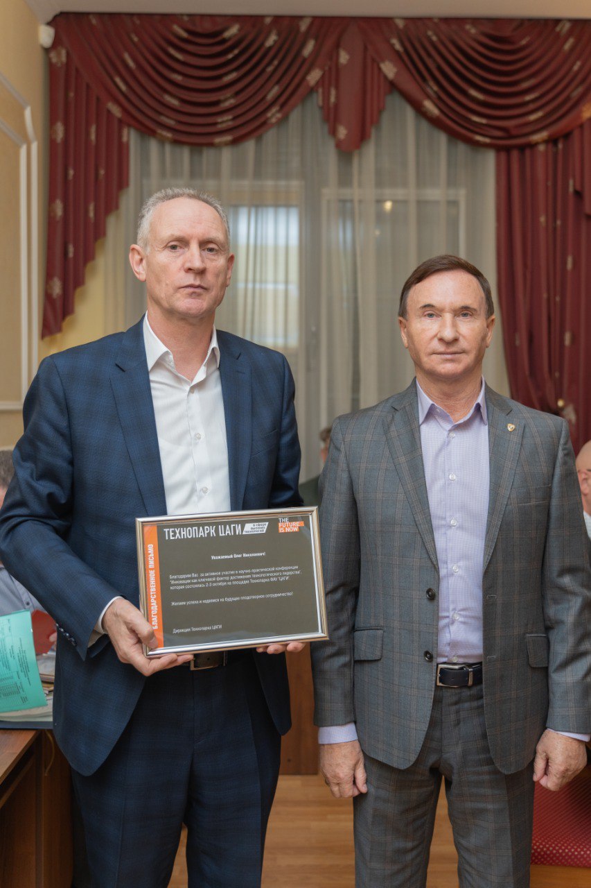 Благодарственными письмами за активное участие в научно-практической конференции «Инновации как ключевой фактор достижения технологического лидерства», которая состоялась в Технопарка в сфере высоких технологий ФАУ «ЦАГИ», были награждены Олег Николаевич Андрух, Виталий Евгеньевич Ананьев и Андрей Александрович Кот.